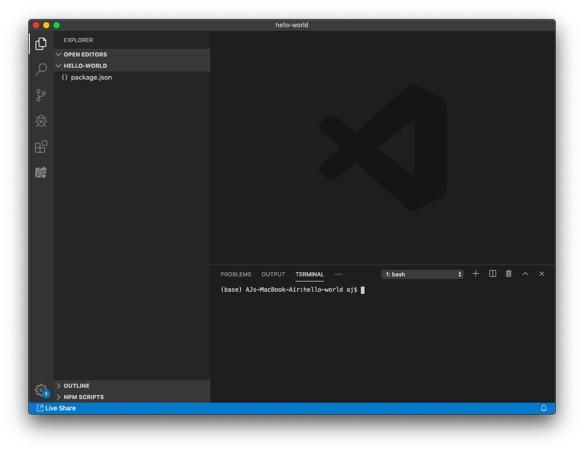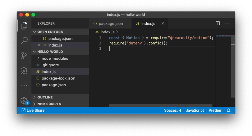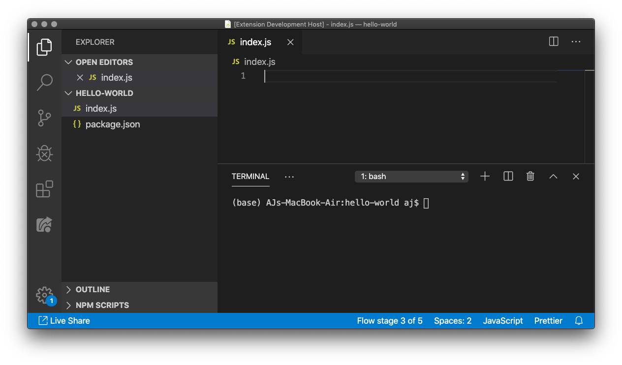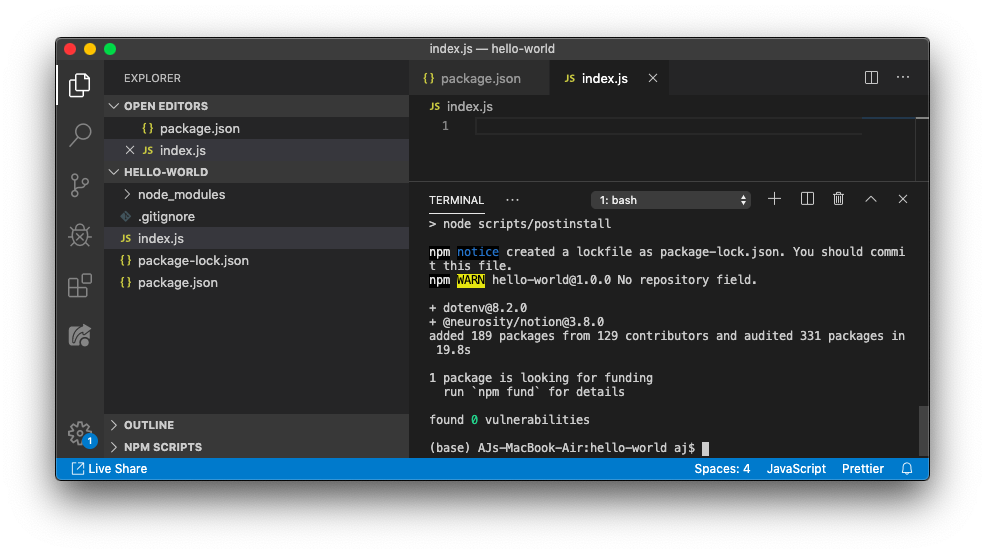Your index.js file is now ready to print Hello World!