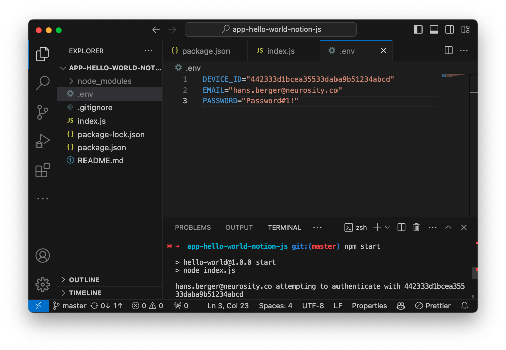 Next, we'll add a .env to store our deviceId, login, and password. Add a new file called .env and add your deviceId, email, and password. Learn how to find your device ID.