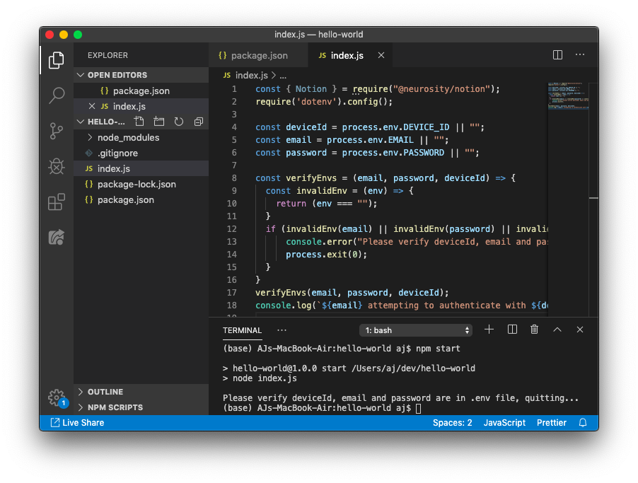 The first dependency we need to install the Neurosity SDK. We'll end up using some environment variables from a .env file, so go ahead and install another dependency for that as well. From the command line, enter:
