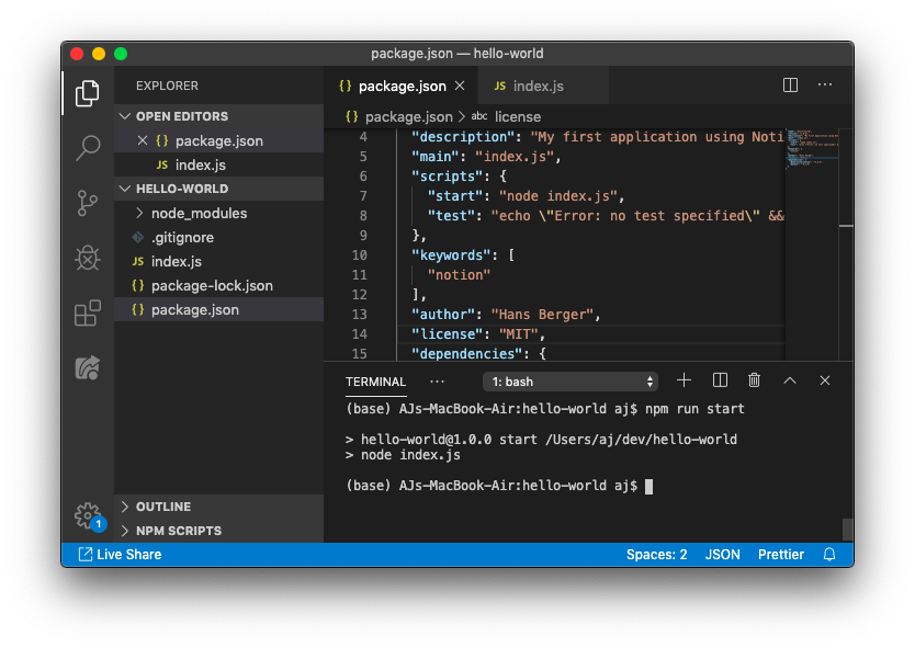 Now head over to the file called package.json. The package.json is at the core of every Node package. Ignore the file called package-lock.json, it's automatically generated.